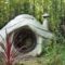 La maison se compose de trois parties : un espace central, un espace de couchage et un espace de bain. L’espace central est accessible par une porte en bois qui peut être laissée ouverte/fermée grâce à un toit rose gonflable.