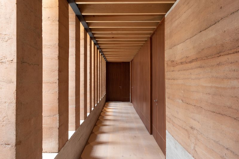 À l’extrémité opposée du volume, à côté de la pièce de vie, un studio d’art à double hauteur se connecte à son propre poste de travail , le patio d’un côté et à un couloir reliant l’aile de la chambre de la maison de l’autre côté. L’aile de la chambre est entièrement construite en pisé de 70 cm d’épaisseur, offrant une vue sur le jardin et la piscine depuis chaque chambre. Les murs sont composés d’un rythme latéral de colonnes en pisé d’un côté, et de murs et portes en bois de l’autre, divisant les volumes qui abritent les salles de bains et les dressings.