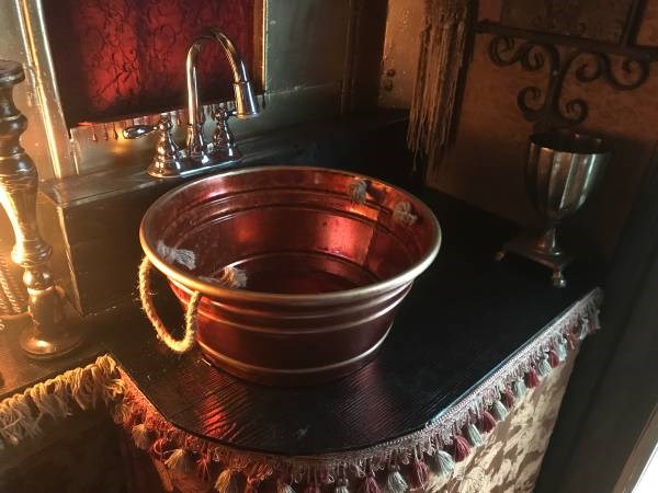 La grande salle de bains intègre un évier décoratif, une baignoire galvanisée et des toilettes qui se branchent directement aux évacuations collectives.