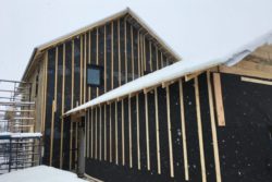 « Springhouse » est une construction en bois à double paroi, équipée d’une isolation en cellulose dense de 17″. Cobb et Murray ont choisi d’équiper de panneaux de fibres de bois, de doubles bandes de fourrure et d’un revêtement vertical en pruche. Le montage mural a une valeur d’isolation totale de R-69.