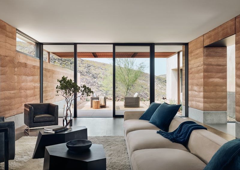 Les ailes déployées encadrent un paysage privé tout en bloquant l’exposition ouest et les vents d’hiver du nord. Les textures, couleurs et matériaux de la maison s’intègrent parfaitement au désert environnant. Les murs en terre battue sont exposés des deux côtés et s’étendent de l’intérieur vers le paysage, reliant les espaces intérieurs aux patios et à la cour.