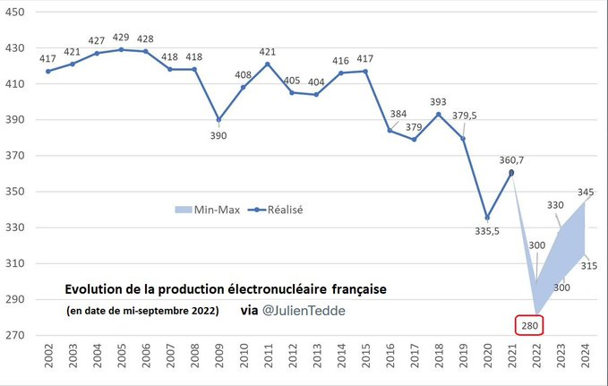 Pendant ce temps-là, EDF s’est embourbée dans l’entretien de son vieux parc nucléaire, avec des mises aux normes consécutives à l’événement de Fukushima et surtout la découverte de fissures suite à de la corrosion sous contrainte de tuyauteries connectées au circuit primaire principal de réacteurs nucléaires, pourtant les plus récents d’EDF. Cela mis hors circuit une douzaine de réacteurs en 2022 alors que le parc en activité était le plus bas historique (32 réacteurs sur 56 à l’arrêt).
