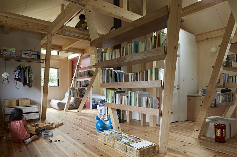 Pièce principale avec des colonnes bois étagères – Y-House par Kensuke Watanabe – Kamakura, Japon