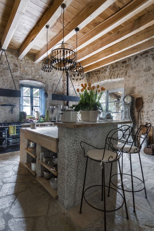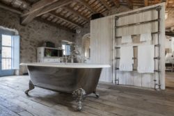 Pour la décoration, des meubles anciens ont été acquis au Royaume-Uni et en Espagne pour convenir à une ferme européenne historique. Des touches audacieuses et contemporaines, telles que des accessoires de salle de bains chromés et des œuvres d’arts modernes, apportent un look du 21e siècle, créant un mariage élégant entre le charme antique et le luxe moderne.