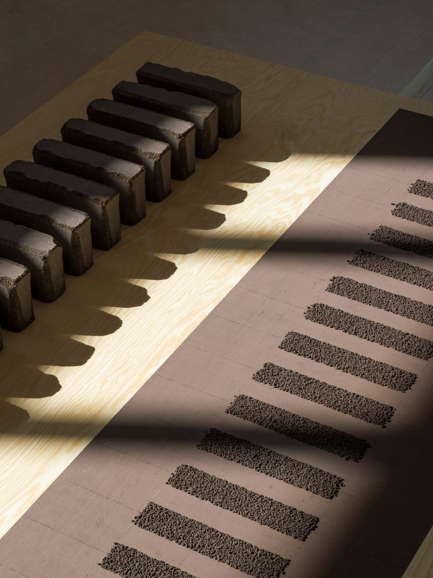 Nommée Reset Materials, l’exposition du centre d’art de Copenhague offre une vitrine de fragments architecturaux fabriqués à partir de 10 matériaux différents à faible teneur en carbone, dont la terre, le biociment, le mycélium, le silicium et la paille.