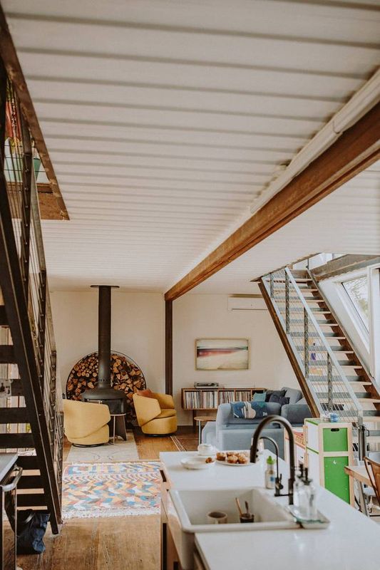 Une attention particulière est accordée à la qualité des magnifiques planchers de bois. L’ensemble du plancher de c-Home préserve le plancher d’origine des conteneurs, qui est fait d’un contreplaqué de bois franc solide et durable avec de grandes planches vissées dans les solives d’acier du conteneur en dessous. La zone sous le bois du plancher est entièrement isolée avec de la mousse pulvérisée et fermée pour le garder au chaud. Les plaques d’acier du conteneur (où il se connecte à un camion sur la route) sont également exposées et créent un motif dans toute la maison. Les contreplaqués et plaques d’acier sont poncés légèrement pour éliminer la saleté, les marques importantes et les éclats, le tout avec une finition mate. Ce processus garantit une surface pour pieds nus à la fois élégante et facile à nettoyer.